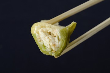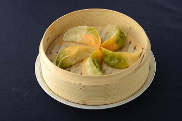 赤・緑・白という鮮やかな三色の皮は人参・ほうれん草が練りこまれたものです。鮮明な色にハッと目を奪われますが、口にすれば心を奪われる事でしょう。蟹肉・ホタテ貝柱と丁寧に泡だて炒めた卵白・バターを折り混ぜた具材達はとても上品で気品ある味わいです。バターと貝柱の香りが広がる洋風餃子。野菜が練り込められた皮は本来のもちもち感を保持しつつ,美しい色相で、栄養までしっかりとれる優れもの。目で楽しみ、心で味わって十二分にご堪能ください。